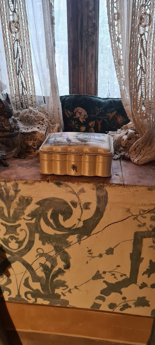 Scatola in legno ricoperta di seta dipinta. Chiave d’origine