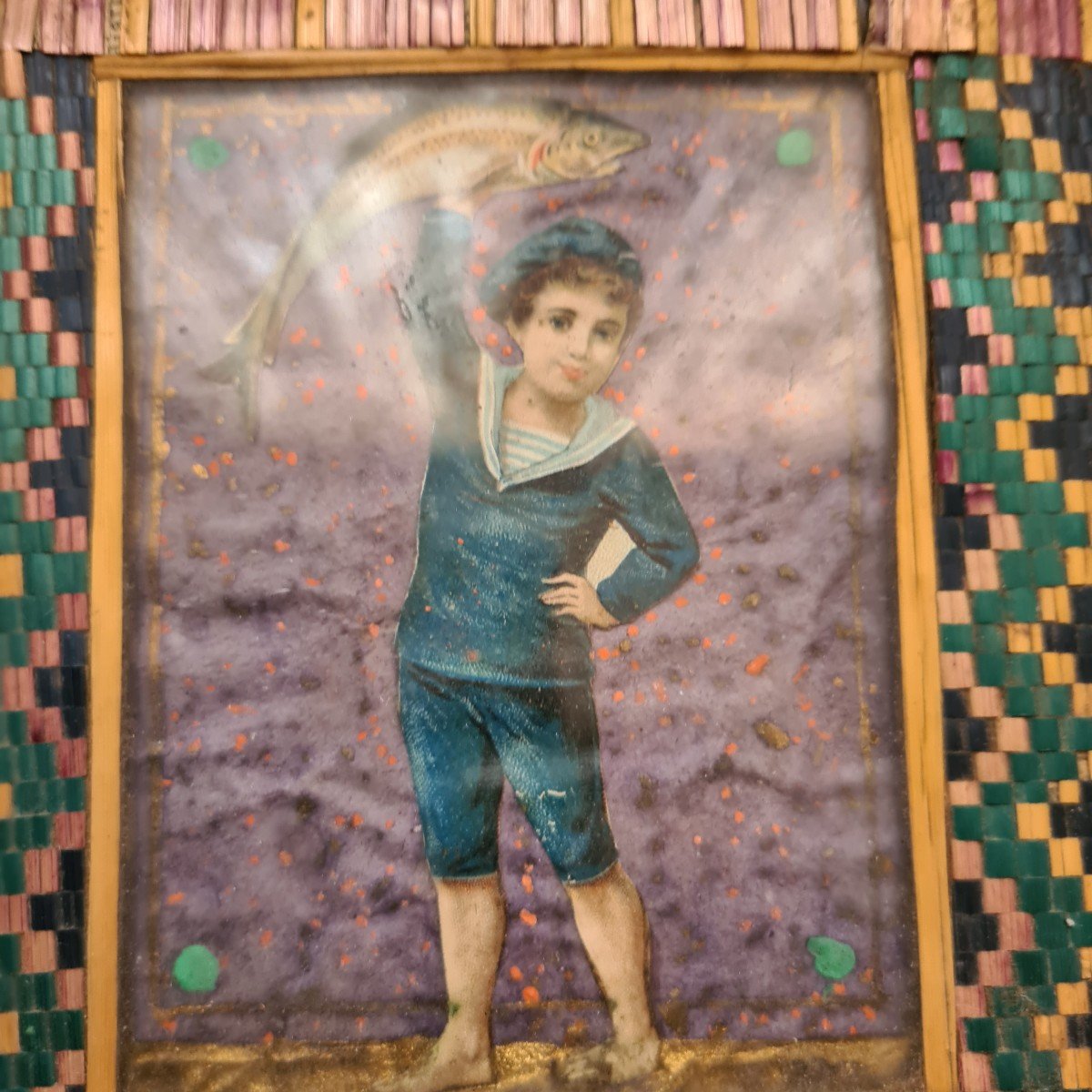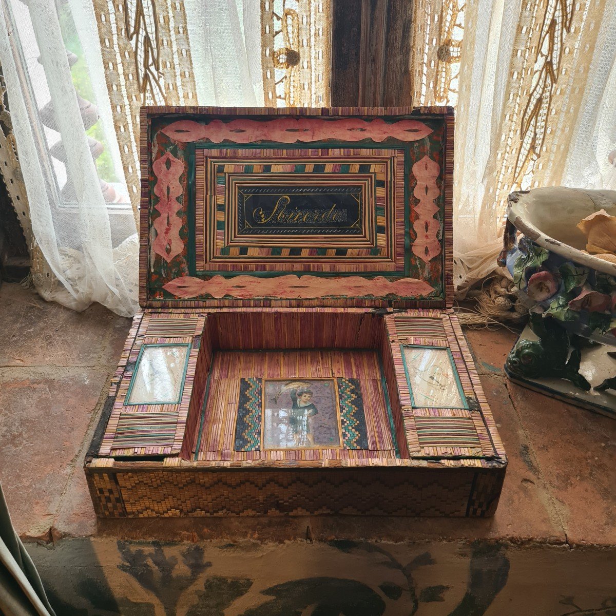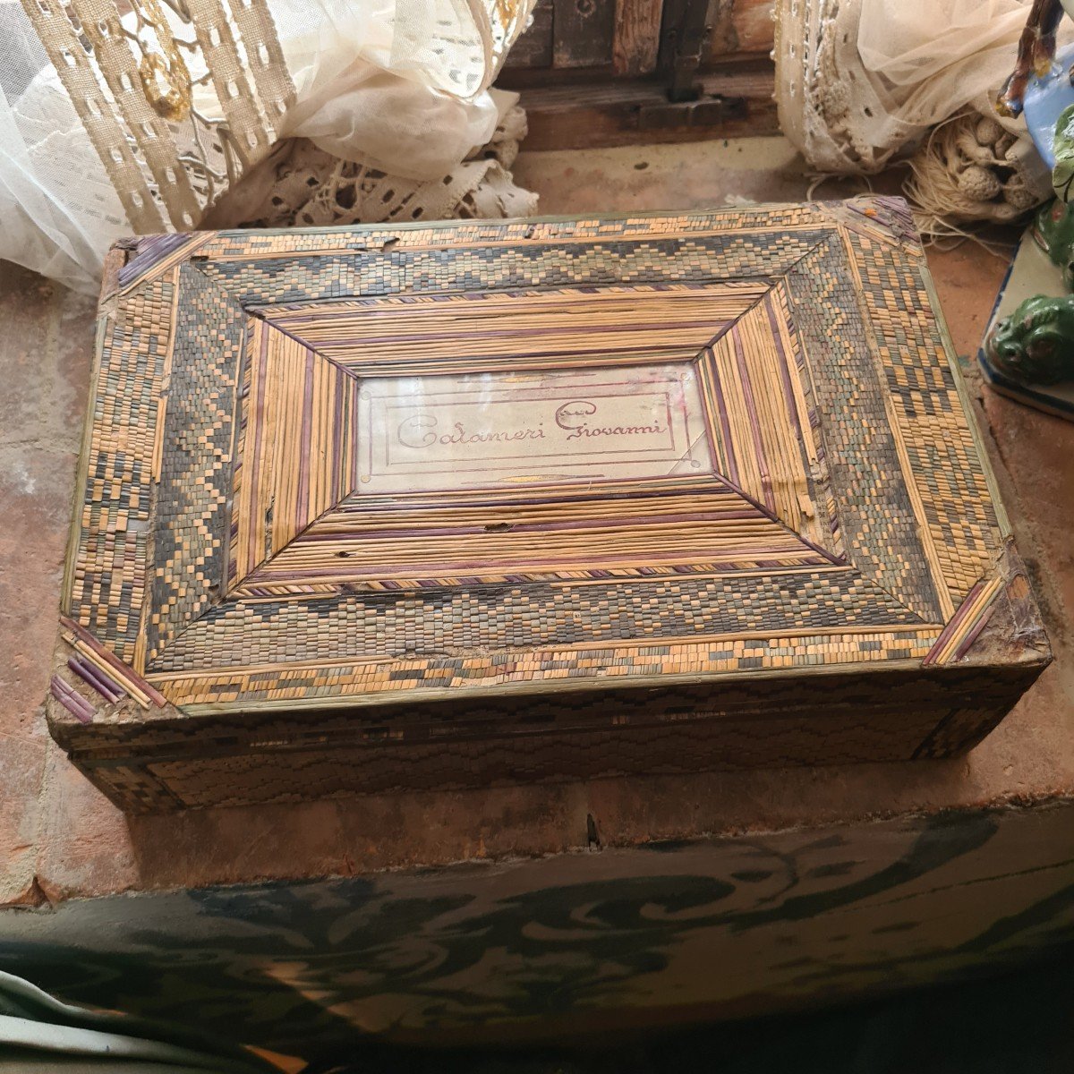 Scatola ricordo in marqueterie di paglia con il nome del suo antico proprietario